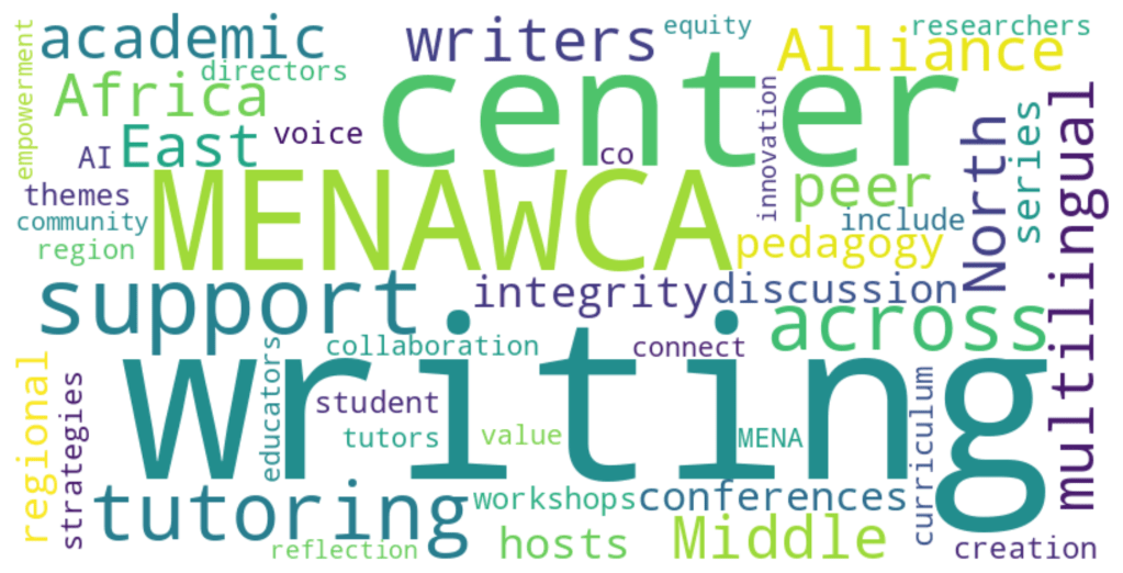 The Middle East-North Africa Writing Centers Alliance (MENAWCA) mission is to foster communication and provide a forum for concerns among writing centers in the region. An affiliate of the International Writing Center Association, MENAWCA hosts a biennial conference.